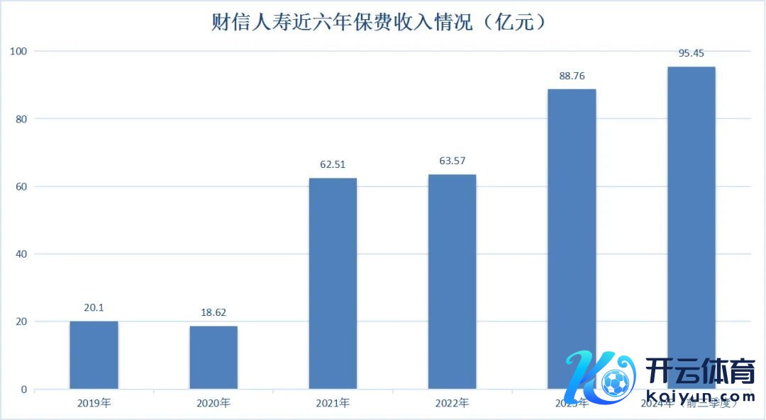 先来看保费收入,2019年至2020年,财信东说念主寿分辩达成保障业务收入20.1亿元、18.62亿元;并在2021年迎来爆发式增长,连忙攀升至62.51亿元;随后两年稳步增至63.57亿元、88.76亿元。2024年前三季度,财信东说念主寿达成保障业务收入95.45亿元,同比增长21.7%,全年有望置身“百亿俱乐部”。
