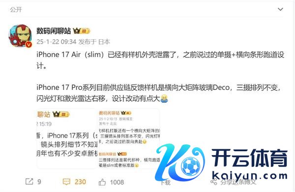 快科技 1 月 22 日讯息万博体育app下载,博主数码闲话站爆料,iPhone 17 Air 样机选拔单摄 + 横向条形跑说念盘算推算;iPhone 17 Pro 选拔横向大矩阵模组盘算推算,三摄罗列保抓不变,闪光灯和激光雷达右移,变化较大。