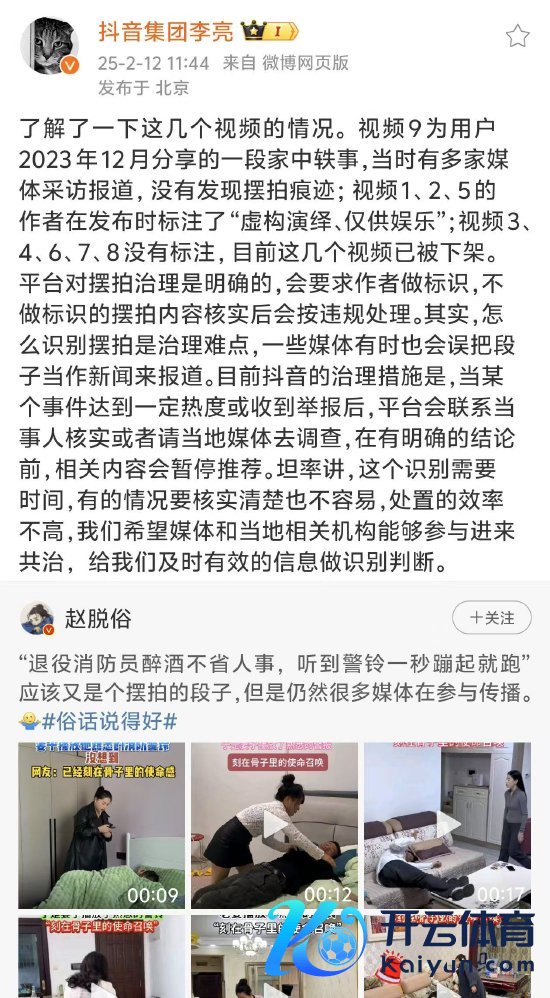 新浪科技讯 2月12日下昼音问,本日,抖音集团副总裁李亮在微博发文回答视频“摆拍”乱象。